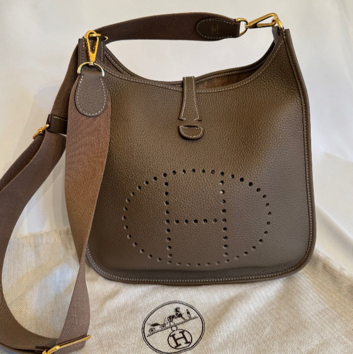 Pristine Hermes Evelyne III in Etoupe Clemence Leather with tonal crossbody strap. This lovely preloved bag was kept unused.